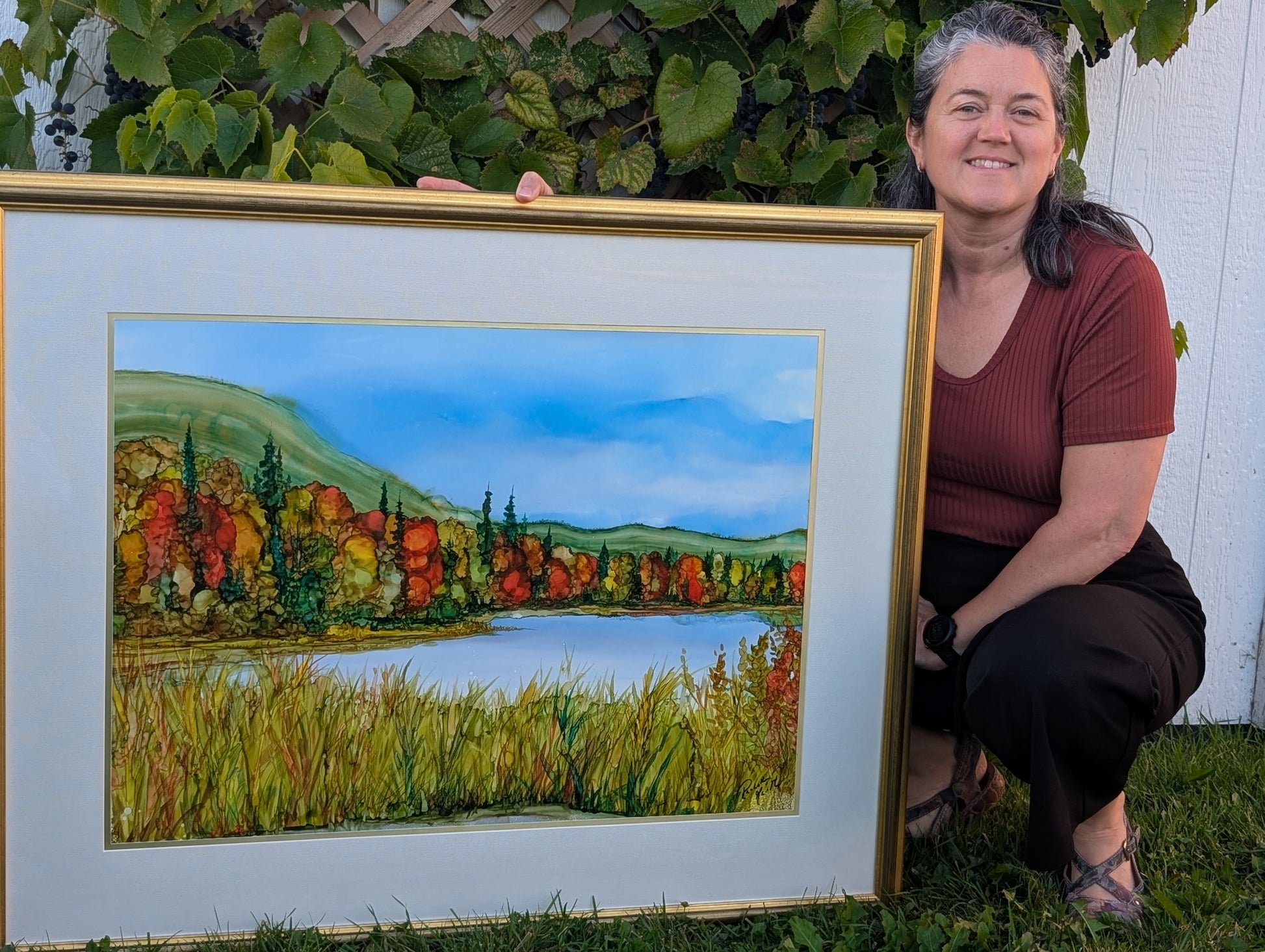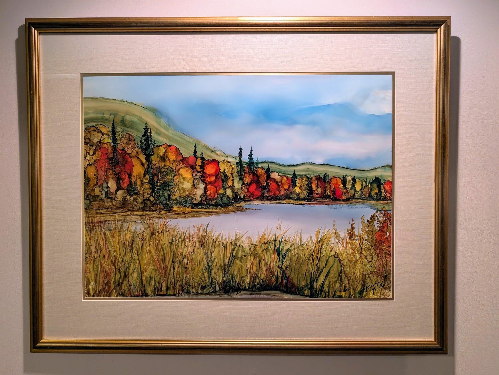 L'œuvre, « La plus douce des romances », est inspirée d'un de mes séjours à l'Anse St-Jean lors d'un atelier artistique. L'automne étant l'une de mes saisons préférées, celle-ci me chante la pomme. Elle m'invite à ralentir, à m'inspirer et à me nourrir de ses couleurs.
